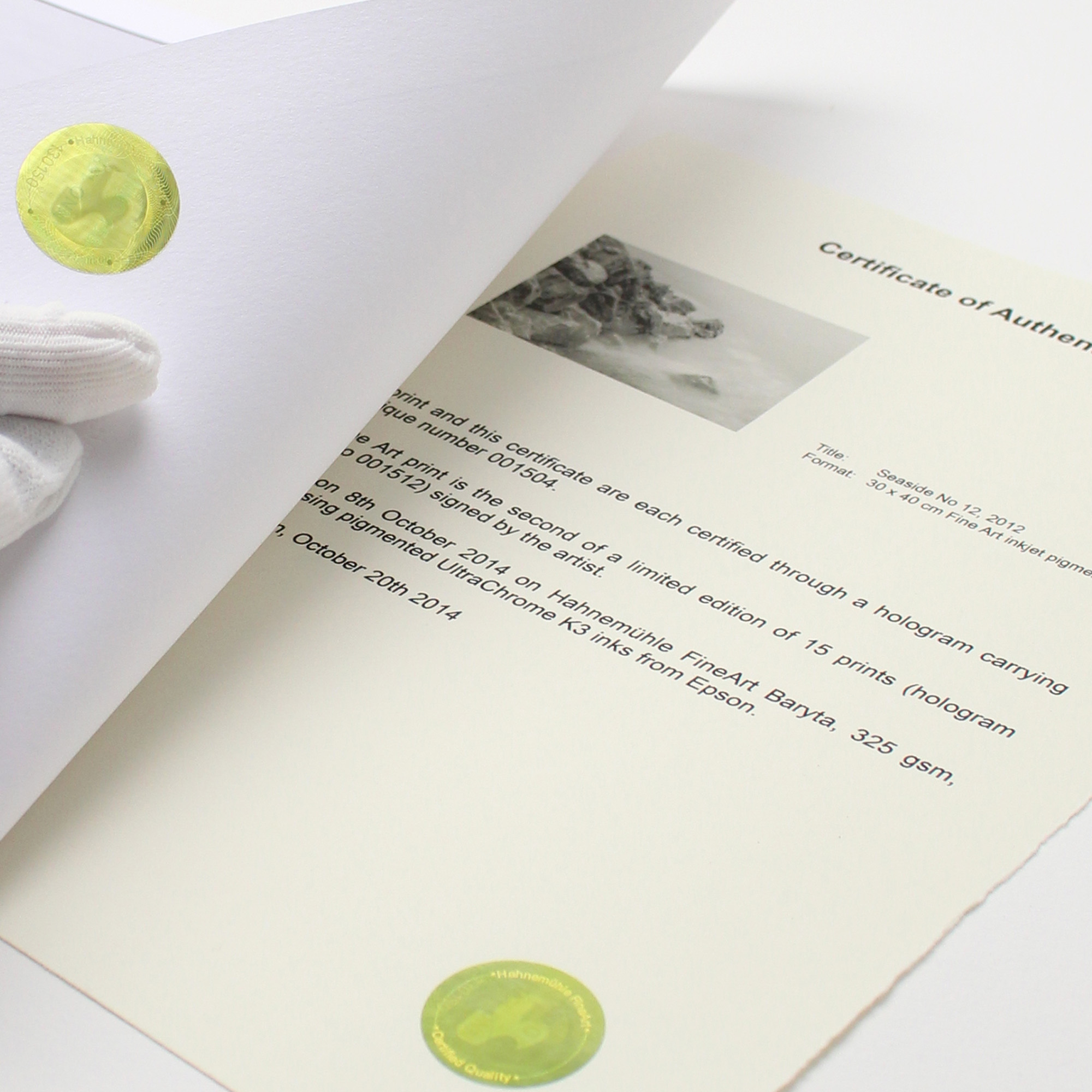 Cada certificado consiste en un papel de molde cilíndrico de alta calidad con una marca al agua Hahnemühle y fibras de seguridad fluorescentes. Cada hoja es dotada con un holograma en numeración continua. Un segundo holograma idénticamente numerado puede ser fijado directamente en el reverso de la obra de arte.