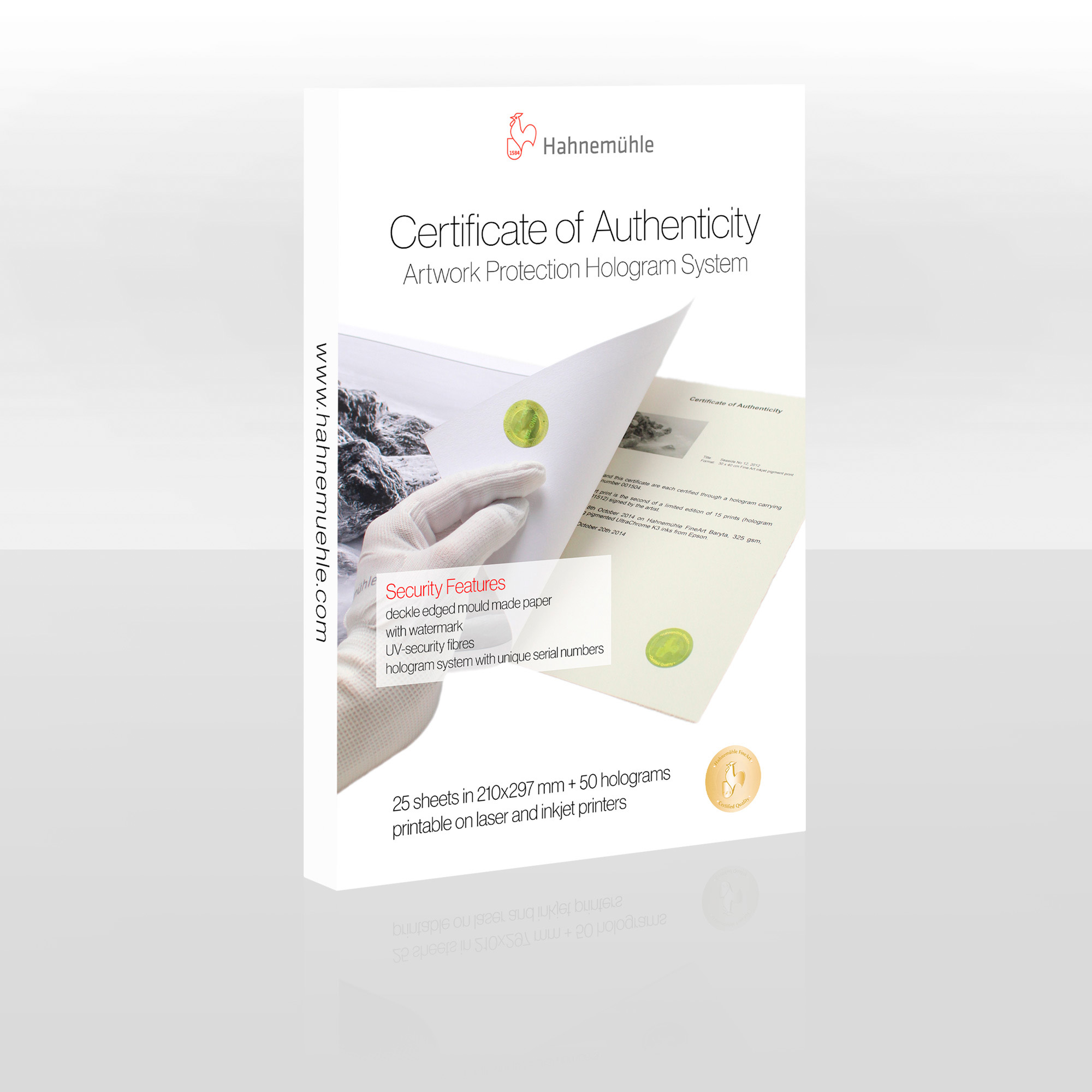 - Los certificados de autenticidad de Hahnemühle son muy útiles en el mundo del arte no sólo para fotografías u obras artísticas, sino también son adecuados para otros objetos y obras de arte para registrarlos como únicos o de edición limitada. Se trata de un documento de identificación único y de valor añadido.